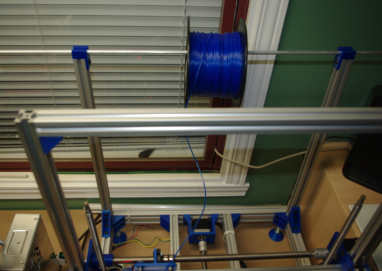 This is a very simple spool holder built from 20 mm x 20 mm aluminium extrusion. The upper round rod supporting the spool is also made from aluminium. Its diameter is 6.35 mm (1/4″). The length of the two bars making the vertical frame of the spool holder depends on the printer. Mines are 44 cm long.