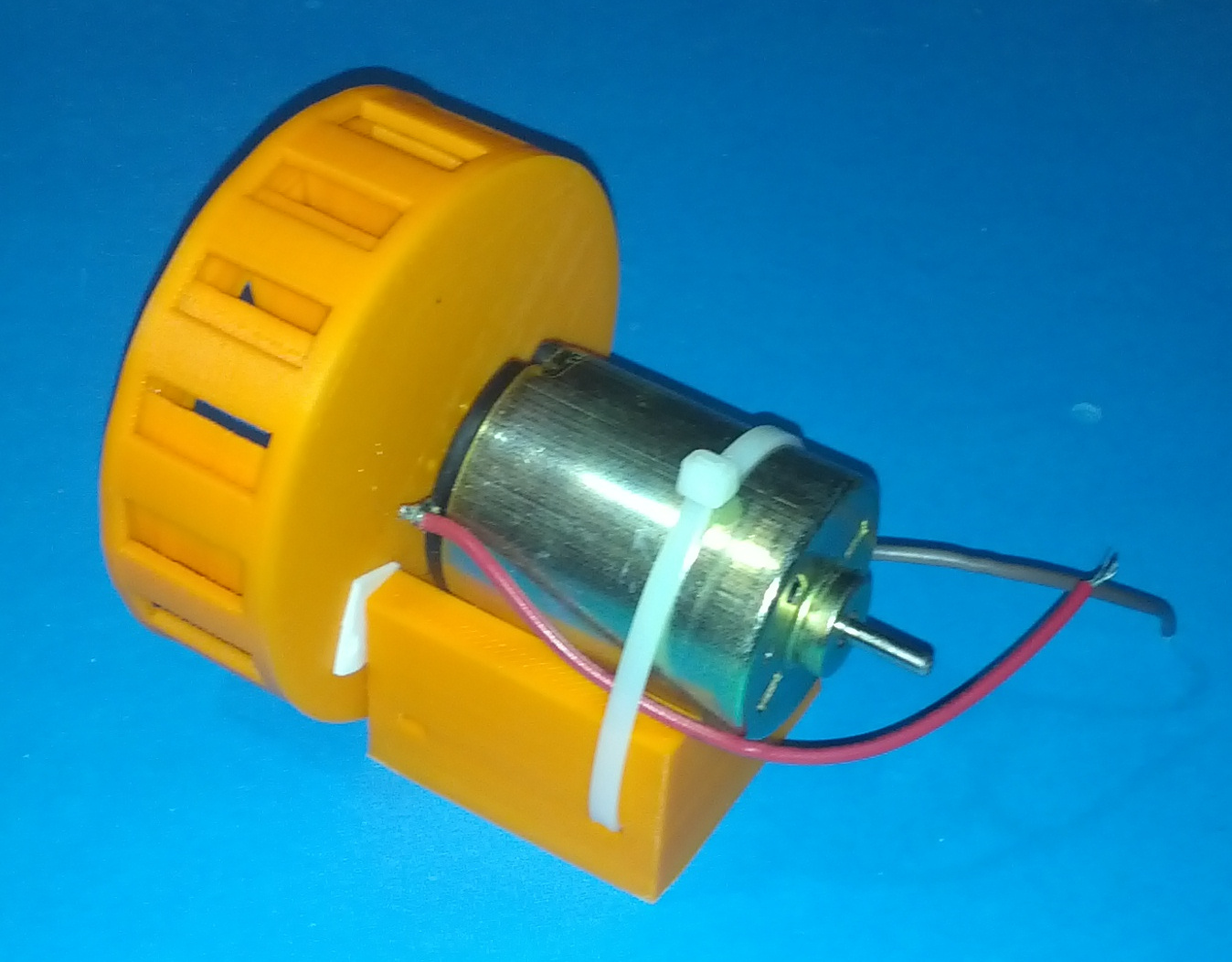 It can nevertheless be used for other purposes. Within the SCAD file, specify the motor diameter, the motor length, the base width, the desired shaft height from the bottom of the base and the tie wrap size. Render the STL file and print it!
