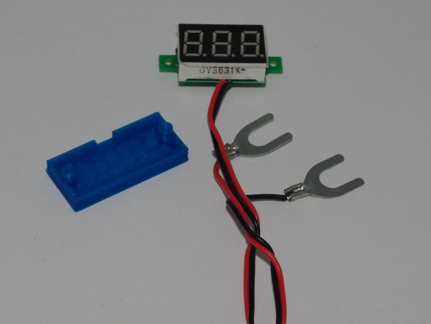 This is a simple plate for a cheap voltmeter. The voltmeter dimensions are 23 mm x 14 mm. The holes to screw the voltmeter to the plate are 28 mm apart. Once the voltmeter is on the plate, glue or double face tape is used to mount is on whatever you want.