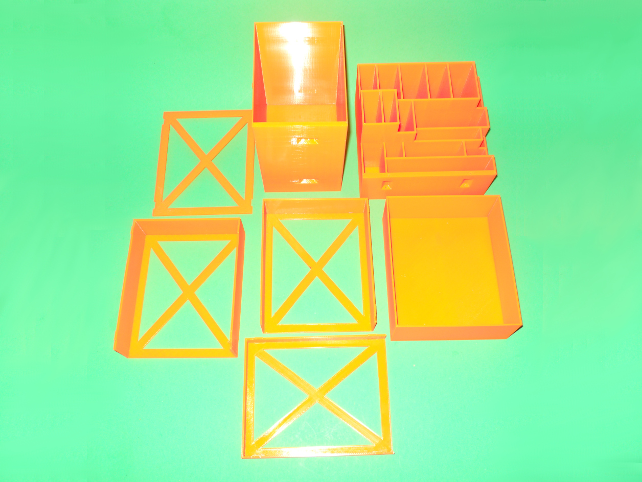 This is a parametric modular bench organizer generator. It allows you to create as many modules as needed, which all fit together seamlessly. A small amount of 1.75 mm filament is required for assembly.